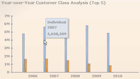 The Year-over-Year Customer Class Analysis (Top 5) bar graph displays five years of sales data for all subsystems. Depending on the subsystem selected, data will be displayed for customer class. Each different colored bar graph represents a different customer class. Click a different subsystem to change the displayed data. Hover over a bar in the graph to display the customer class, year, and total sales amount.