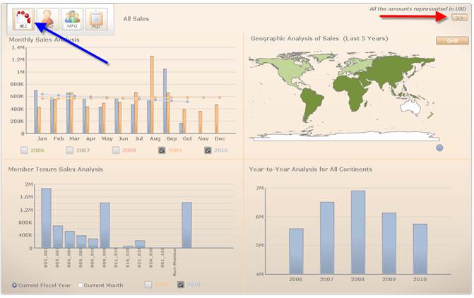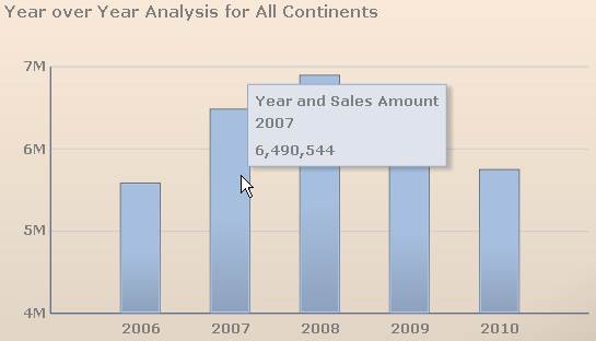 By default, the Year to Year Geographic Analysis displays fives year of sales data for all continents. Hover over a bar in the graph to display the total sales amount for the year.
