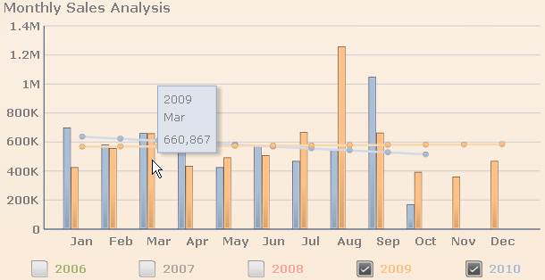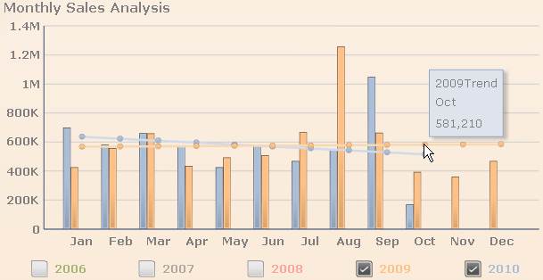 The horizontal line running across the bar graph represents the trend. Hover over a dot on the line to display the year, month, and total trend sales amount.