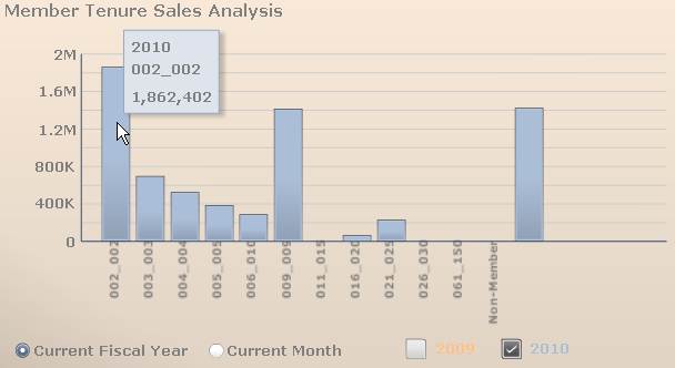 By default, the Member Tenure Sales Analysis bar graph displays member tenure sales data for the fiscal current year for all subsystems. Select a different subsystem, select the Current Month radio button, or check the previous year checkbox to change the displayed data. Hover over a bar in the graph to display the year (or month), member tenure, and total sales amount. The member tenure is configurable through app type codes.