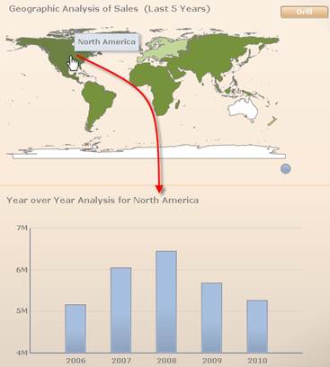 Click a continent to display data for the continent in the Year over Year Analysis bar graph below. Click Drill to further drill down to view totals by states. Click Drill Up to return to the previous map view.