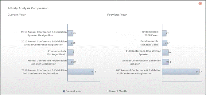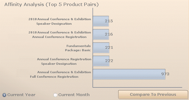 By default, the Affinity Analysis bar graph displays the top five total annual count of product pairings for the current year. The number in the bar on the graph represents the quantity. Select the Current Month radio button to change the displayed data.