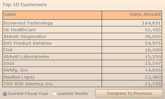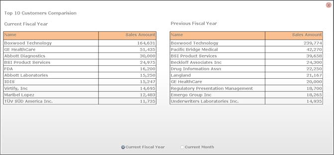 The Top 10 Customers section displays a table listing the top ten customers and the sales amount for the current fiscal year (or month). Select the Current Month radio button to change the displayed data.