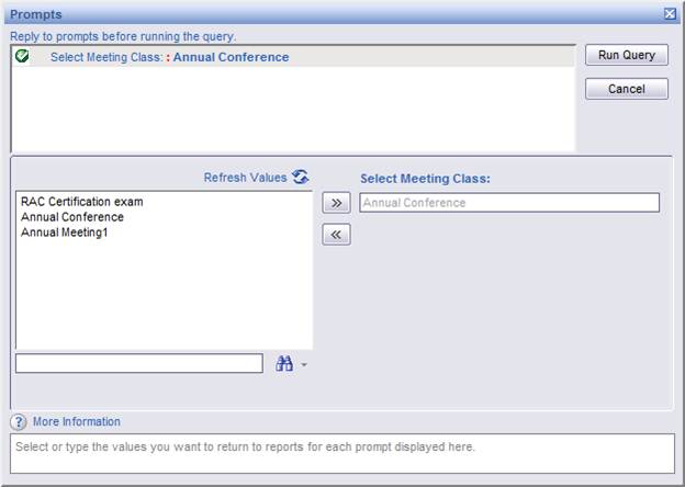 This Meetings Advantage report contains four reports: When Register, When Register (chart), Join Date to Register Date, and Join with Registration. When you open the When Registrants Register Report, you will be prompted to select a meeting class.
