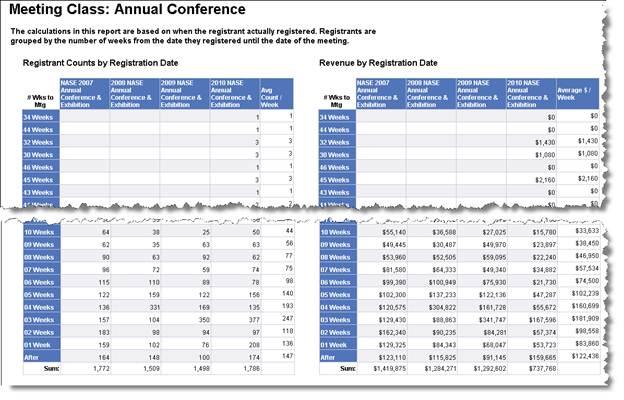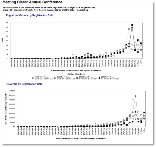 The When Register report provides registrant counts and amounts—in tabular form—based on when the person registered (number of weeks prior to the start of the meeting).