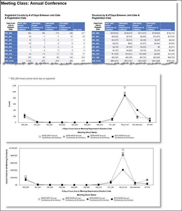 The Join Date to Register Date report provides tabular and graphical representations of the number of days between when registrants join the organization and when they register for the meeting of the selected meeting class.