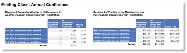The Join with Registration report provides in tabular format registrant counts and amounts for registrants who bought membership and registration products at the same time and for those who did not.