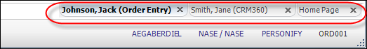 A set of tabs at the bottom of the screen shows all open screens. You can have multiple screens open at once, including multiple instances of the same screen. If you have a record open on a screen and hover over the screen’s tab, the record information displays next to your mouse. As of 7.3.1, if the information you're viewing on the screen is specific to a customer record, the customer's name will display on the tab, as well as the screen name in parentheses.