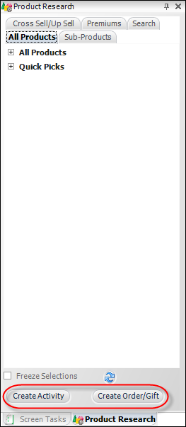 At the bottom of the Product Research tab (shown below), you have the option to create a new order/gift on the product selected above. Additionally, from the Quick Info window, you can create a new order/gift for the product you're viewing.