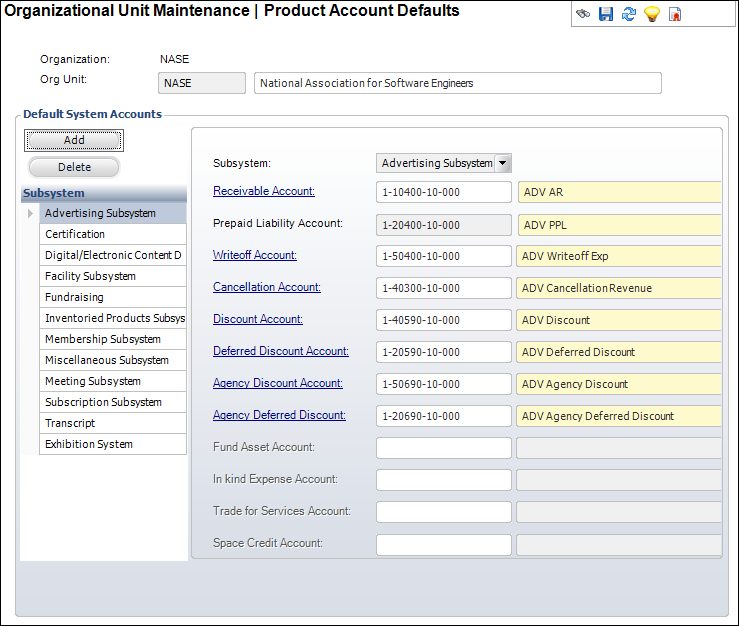 To facilitate the definition of new products, you can predefine default accounts for use with products in each subsystem. The accounts set here automatically populate when a product is set up. Though product accounts can be changed during product definition, they should be defined at the organization unit-level because it saves time later when the same accounts are used for common purposes.