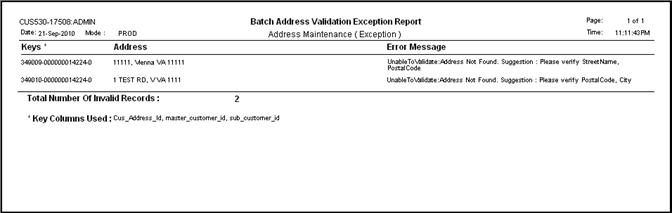 · Address Validation Exception Report – Lists all addresses reviewed by the batch job but could not be validated as “Good” or modified by the Spectrum software. This report includes the error message as to why the Spectrum software could not validate or modify the address.