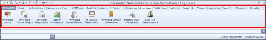 The toolbar serves as your aid in navigating through the application. It organizes the screens by subsystem and general workflow. The options change depending on which persona you choose and the level of security implemented on the persona. For example, if your persona utilizes the Advertising subsystem, you may have Advertising tools in your toolbar like the ones displayed below. This toolbar utilizes the Microsoft Office Ribbon feature introduced in Office 2007. Clicking on a different menu heading displays the associated screen icons and headings.