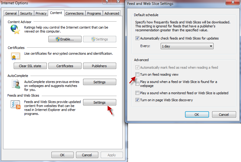 If you are using IE, you may have to turn off “feed reading view”, as shown below:
