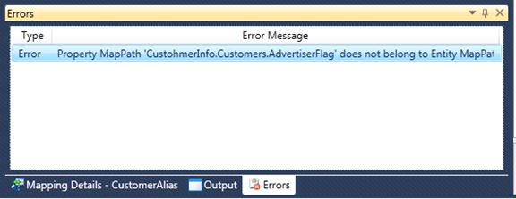 The Personify WSD Error pane as an individual, or together with the group, is resizable, floatable and dockable similar to Visual Studio. The error pane reports the errors, warning and suggestions that are displayed during the development. This interactive pane navigates to the appropriate element (entity, association or service operation) on double-click.