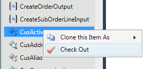To check-out an element, right-click the element and select Check Out, as shown below. Please note that an element can be checked out to only one developer at a time.