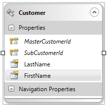 When you extend the parent entity by adding additional properties and publish, only the delta will be stored under the “Customer” layer. For example, Base delivered an entity called Customer with MasterCustomerId, SubCustomerId, and LastName. Then, the developer extends that to add another property called FirstName. Therefore, on check-in, only LastName will be stored under Customer layer, as shown below.