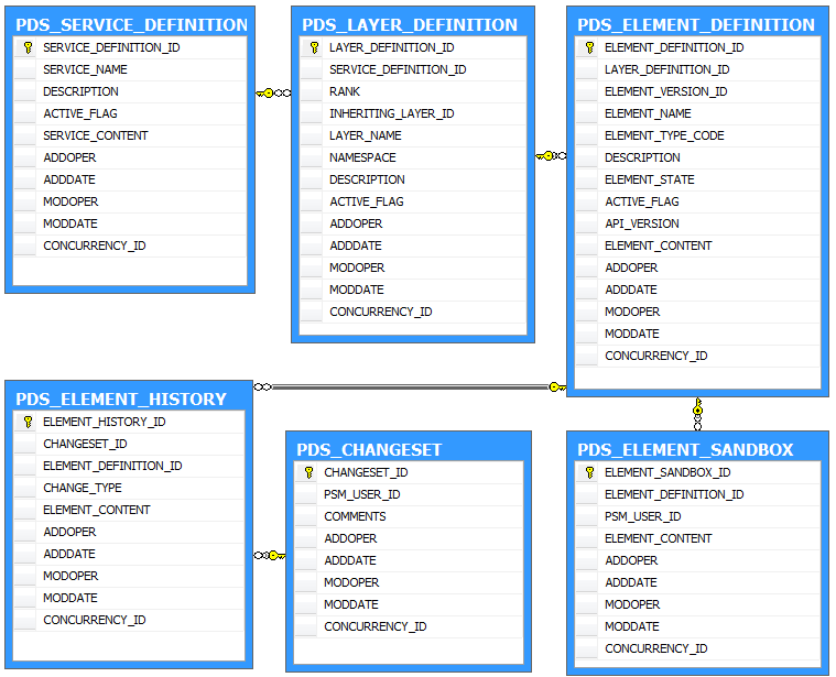 PDS_ELEMENT_SANDBOX, PDS_ELEMENT_HISTORY and PDS_CHANGESET are three auxiliary tables used for source control. Initially all of these three tables will be empty.